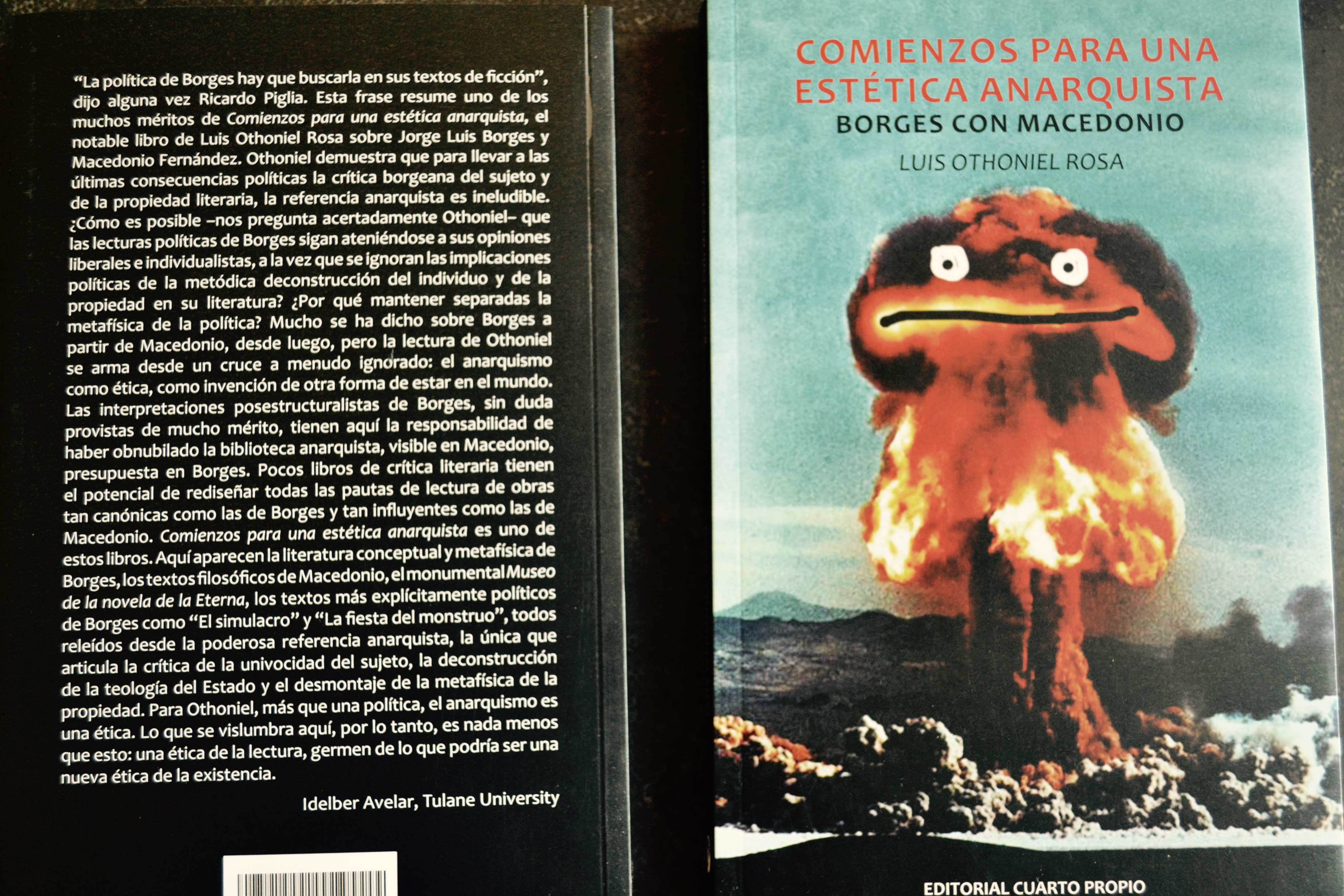 “La política de Borges hay que buscarla en sus textos de ficción”, dijo alguna vez Ricardo Piglia. Esta frase resume uno de los muchos méritos deComienzos para una estética anarquista, el notable libro de Luis Othoniel Rosa sobre Jorge Luis Borges y Macedonio Fernández. Othoniel demuestra que para llevar a las últimas consecuencias políticas la crítica borgeana del sujeto y de la propiedad literaria, la referencia anarquista es ineludible. ¿Cómo es posible – nos pregunta acertadamente Othoniel – que las lecturas políticas de Borges sigan atenié ndose a sus opiniones liberales e individualistas, a la vez que se ignoran las implicaciones políticas de la metódica deconstrucción del individuo y de la propiedad en su literatura? ¿Por qué mantener separadas la metafísica de la política? Mucho se ha dicho sobre Borges a partir de Macedonio, desde luego, pero la lectura de Othoniel se arma desde un cruce a menudo ignorado: el anarquismo como ética, como invención de otra forma de estar en el mundo. Las interpretaciones posestructuralistas de Borges, sin duda provistas de mucho mérito, tienen aquí la responsabilidad de haber obnubilado la biblioteca anarquista, visible en Macedonio, presupuesta en Borges. Pocos libros de crítica literaria tienen el potencial de rediseñar todas las pautas de lectura de obras tan canónica como la de Borges y tan Cover Backcover 2020 influyente como la de Macedonio. Comienzos para una estética anarquista es uno de estos libros. Aquí aparecen la literatura conceptual y metafísica de Borges, los textos filosóficos de Macedonio, el monumental Museo de la novela de la Eterna, los textos más explícitamente políticos de Borges como “El simulacro” y “La fiesta del monstruo, todos releídos desde la poderosa referencia anarquista, la única que articula la crítica de la univocidad del sujeto, la deconstrucción de la teología del Estado y el desmontaje de la metafísica de la propiedad. Para Othoniel, más que una política, el anarquismo es una ética. Lo que se vislumbra aquí, por lo tanto, es nada menos que esto: una ética de la lectura, germen de lo que podría ser una nueva ética de la existencia.” -Idelber Avelar