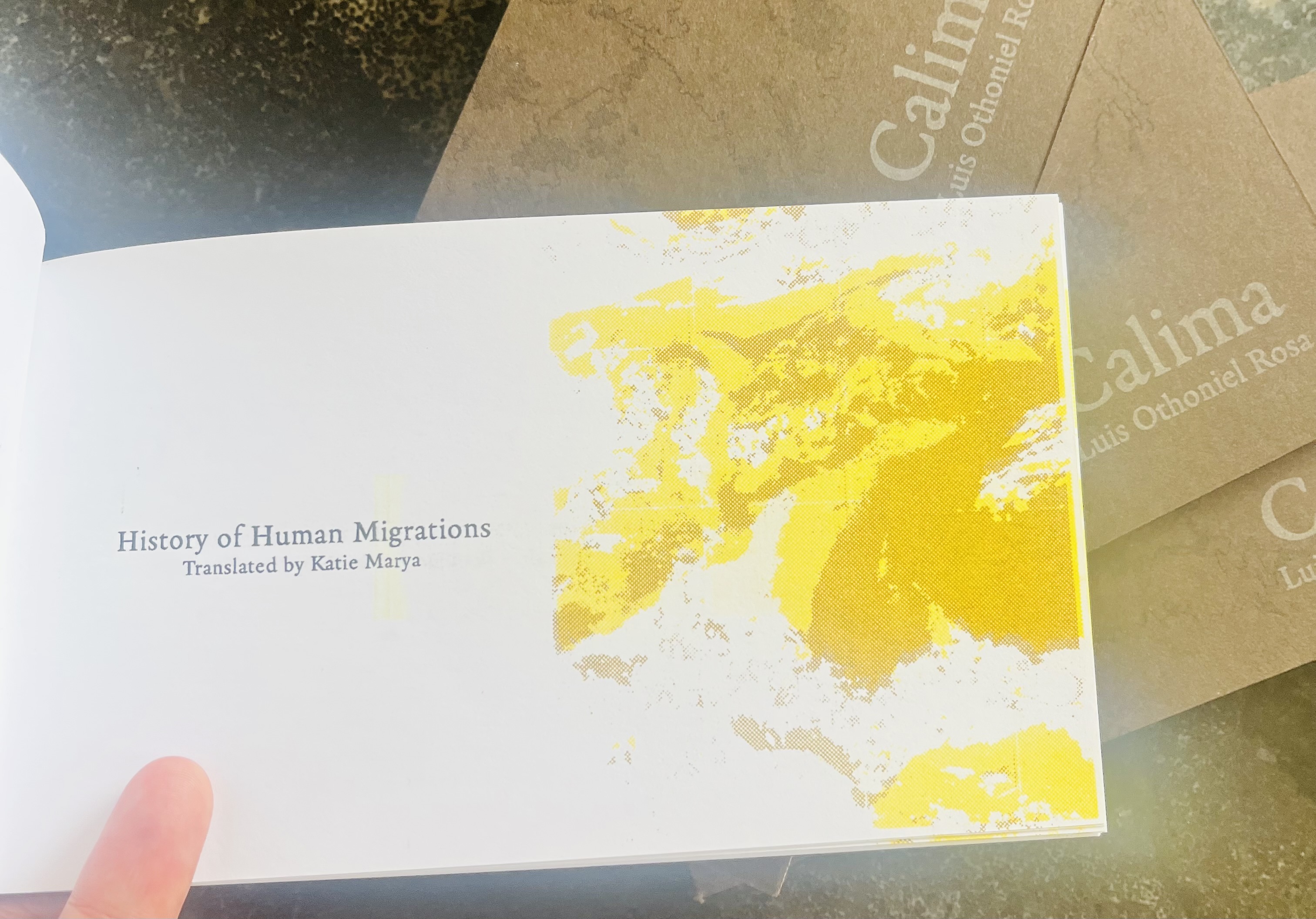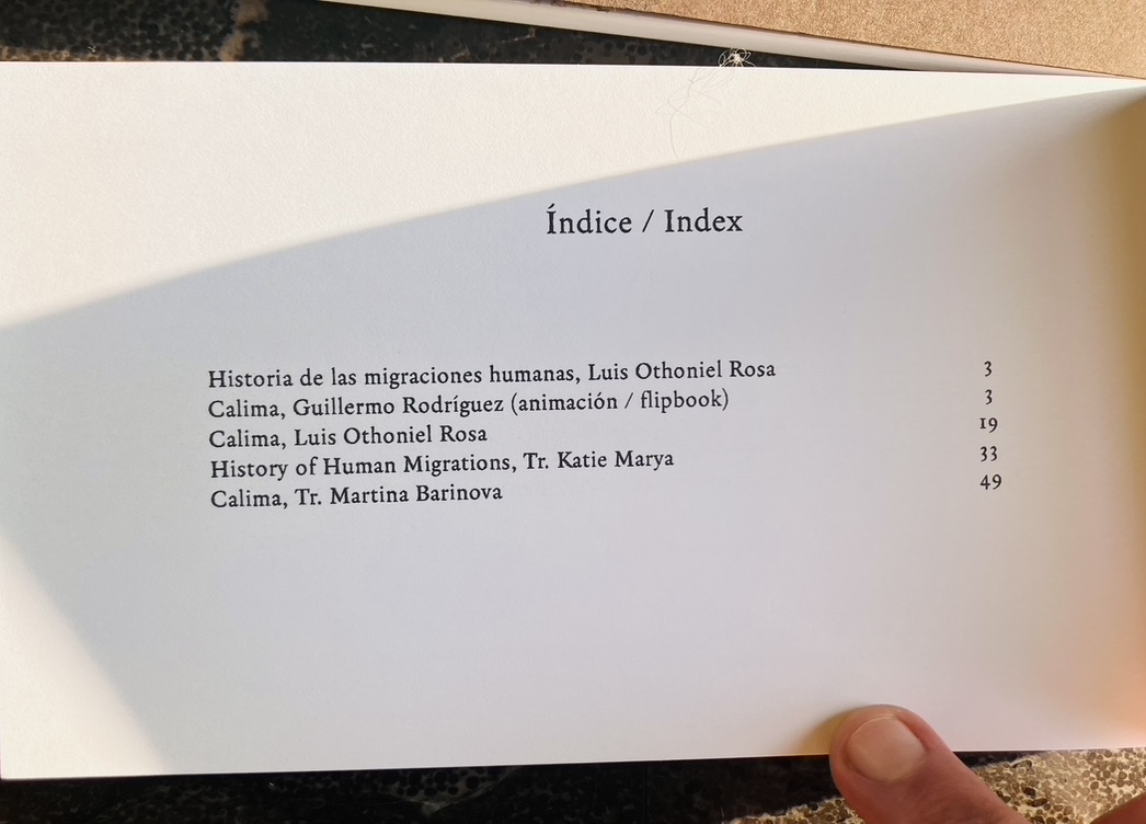 Calima is a bilingual experimental flip book. As you pass the pages you can see doppler images of the Sahara Dust traveling from Africa to the Caribbean. Likewise, the plot connects the two regions; first with a “History of human migrations” that narrates in less than 10 pages the 200 thousand years of human history, and then with “Calima” a short futuristic story set in a utopian future.